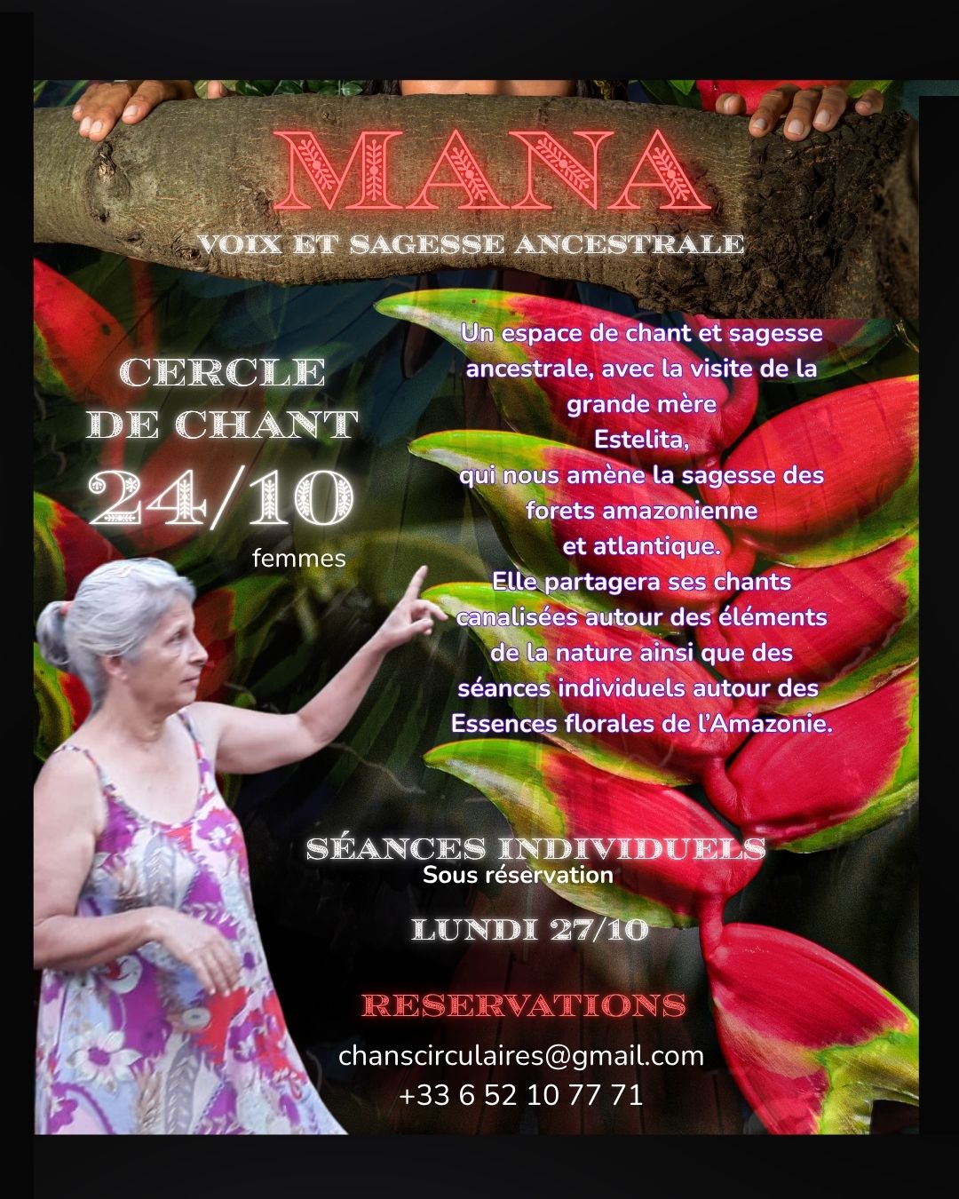 Le 24/10 nous recevons ESTELITA une grande mère de sagesse ancestrale venue de l’Argentine et de passage par première fois à Lyon. Ce évènement s’appelle MANA, cela signifie sœur. ESTELITA en tant que sœur plus âgé m’accompagne à plus de vingt ans et je suis très contente de l’inviter à partager son compilé des hymnes, canalisations autour des éléments et des archétypes (Orixas). Ces hymnes sont une pépite et vous allez avoir la possibilité unique de nous accompagner à les chanter.